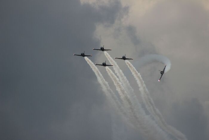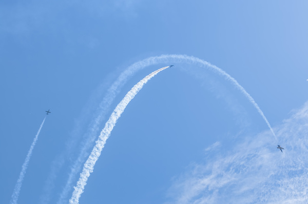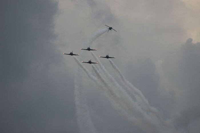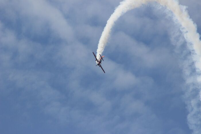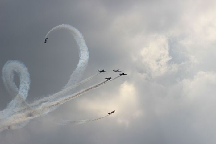 Девушки на ЯКах (а, за вычетом лидера, всеми самолётами управляют именно девушки) вытворяли в небе невообразимое. Летали ровным строем, закладывали виражи, срывались в пике и пролетали над зрителями на бреющем полёте.