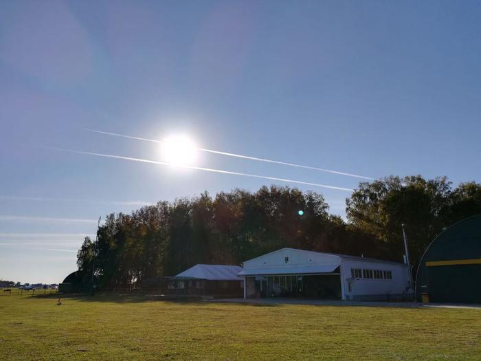 [Инверсионные следы от пассажирских самолётов и ангары]