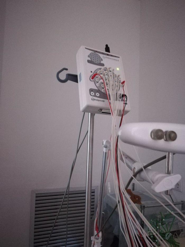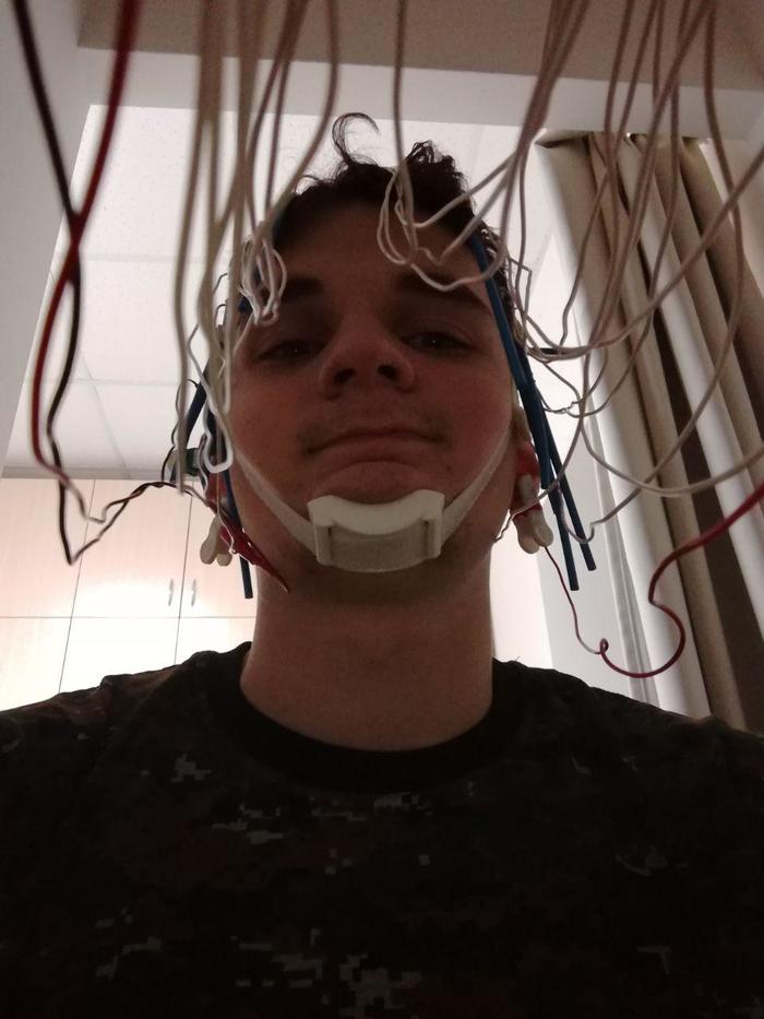 -Мозг. Электроэнцефалограмма. Проверяют наличие: если мозга нет, то в пилоты вы не попадёте. Я прошёл со второго раза. За день до процедуры не сидеть перед экраном, не пить кофе и другие стимуляторы и не нагружать мозг слишком сильно. Если есть те, кто не проходил, то вот так это выглядит: