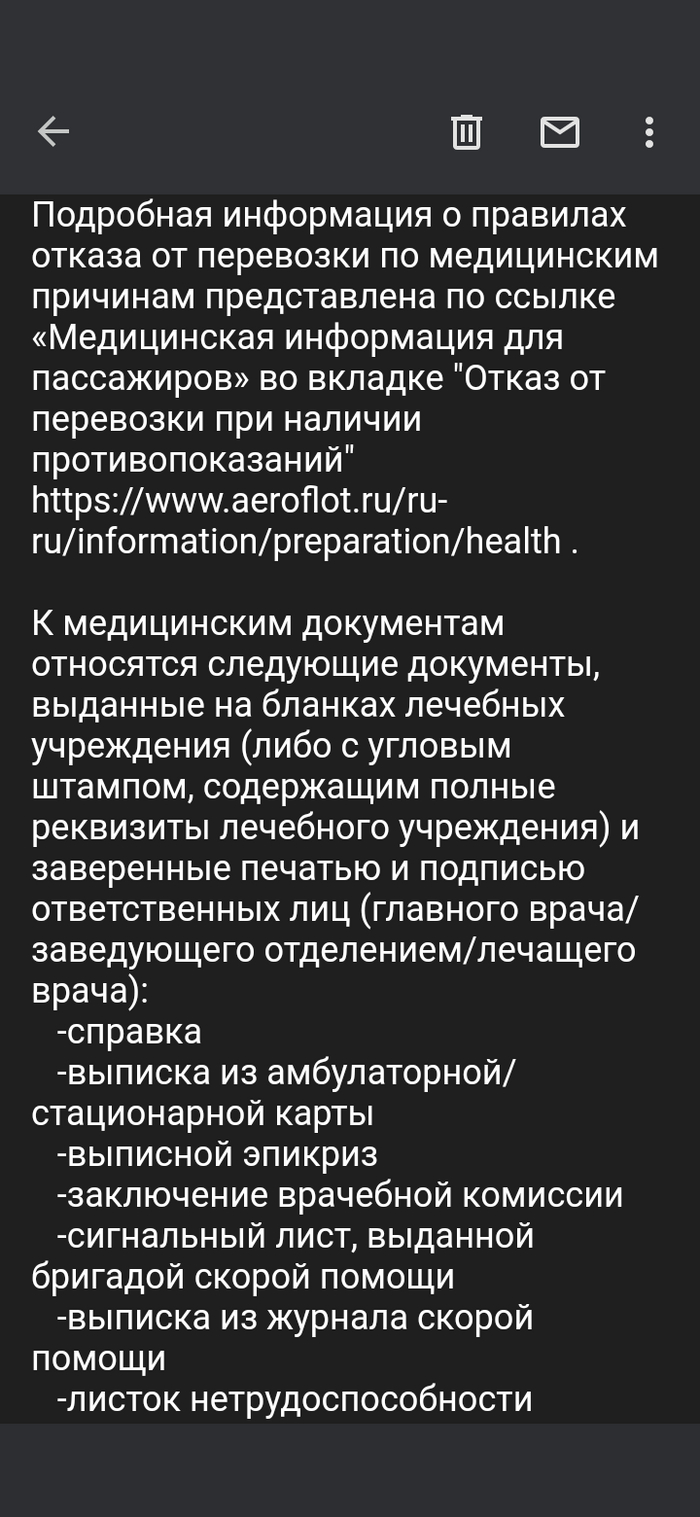 Вызвать врача на дом я не смогла. Пришлось с температурой ехать на такси к дежурного врачу. Вместо врача - фельдшер. Открыла мне больничный. Когда я после осмотра и измерения температуры сказала, что мне нужна будет справка для авиакомпании, она сказала, что не знает, что это такое. В моей электронной карте она пишет, что мне показан амбулаторный режим. При ней позвонила в авиакомпанию. Оператор сказала, что противопоказания к перелёта, постельный режим и пр. должны быть обязательно указаны в документе. Фельдшер сказала, что не понимает. Я поднялась к главврачу, которого не было. Секретарша сказала, что они такое не указывают. Могут только открыть больничный. Я сказала, что я самозанятая, больничный не нужен, нужна именно выписка с информацией. Она опять повторила, что они такое не указывают.