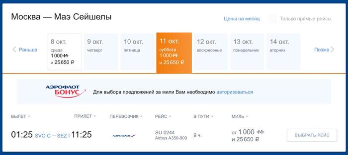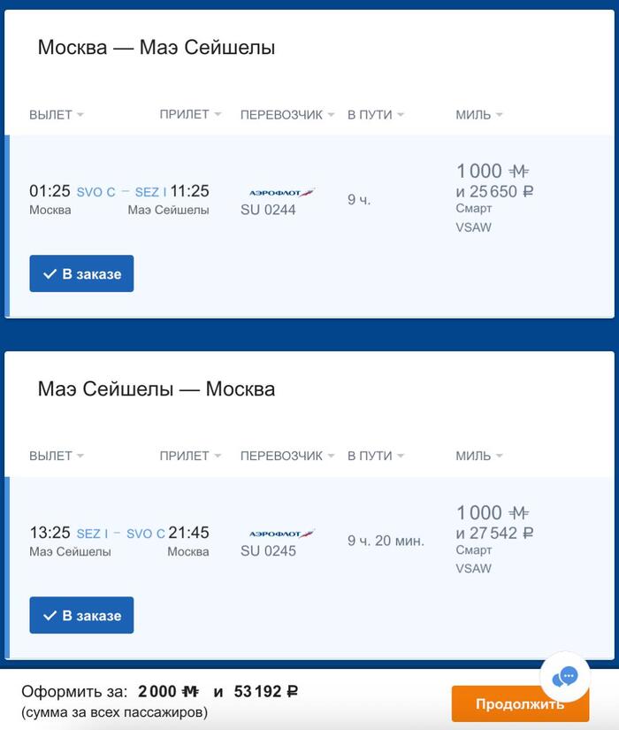 Дело в том, что Аэрофлот втихаря продает билеты на своем официально сайте за 1000 миль + какое-то количество денег. Привожу пример. Например мы хотим полететь на Сейшелы. Заходим на сайт Аэрофлота и видим, что билет стоит около 50 тыс. рублей. Без багажа: