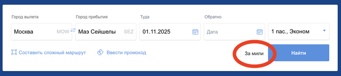 Однако на сайте есть вот такая кнопочка «За мили»: