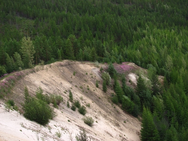 Чего не ожидаешь увидеть на Севере, так это песок. Можно взобраться на вершину ближайшего холма и позагорать на его песчаной лысине, любуясь открывающимся видом. Внизу среди зеленого бархата тайги раскинулся поселок и протянулось полотно железной дороги. Иногда по этому пути проползает длинная цветная гусеница – поезд. Ради таких гусениц и строился тоннель. На этом же холме установлен один из четырех крестов, которые, по мнению местных жителей, оберегают поселок.