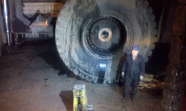 продолжение к посту http://pikabu.ru/story/malenkiy_bolt_4115975.Двигатель на белаз 75306(220 тонн) высота примерно с человека!на заднем фоне сами белазы и вспомогательная техника (вигинс) снимают колеса с белаза.для сравнения колеса на "вигинсе" от маза.