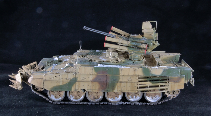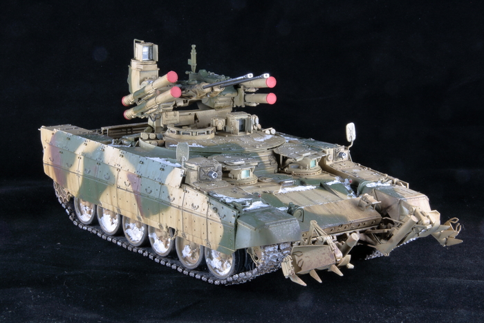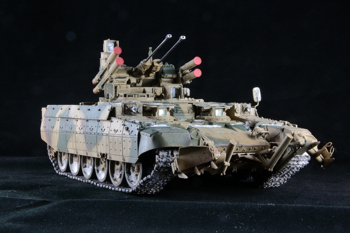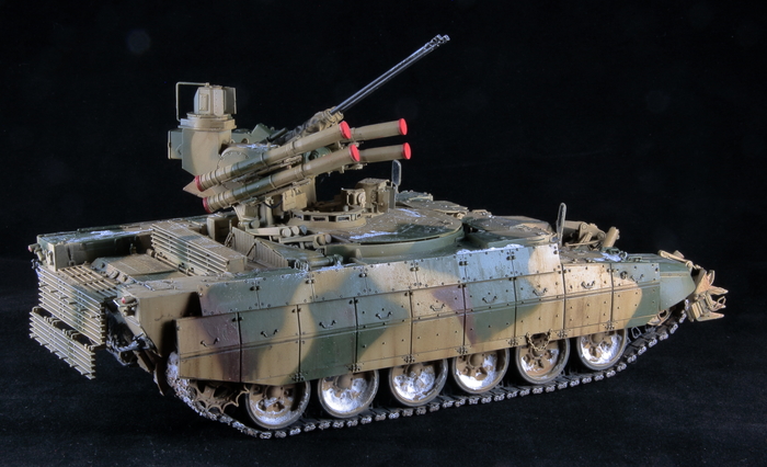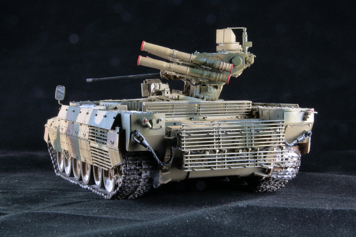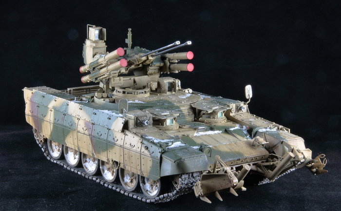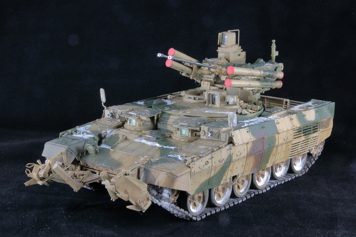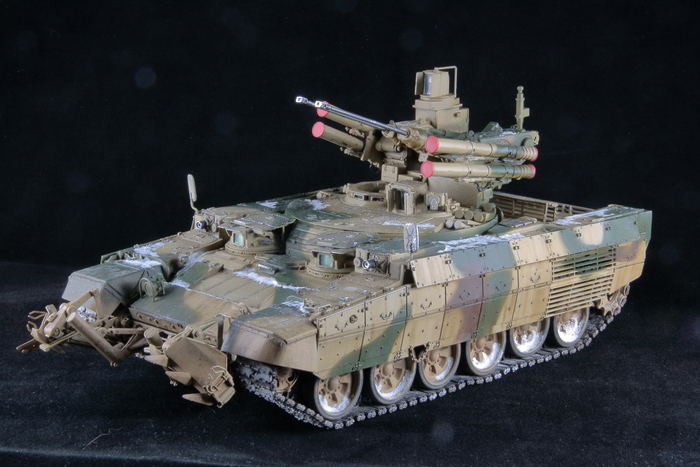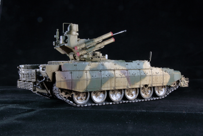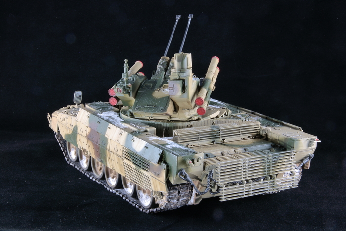 В этот раз опять взяли за основу Т-72, но не стали перекраивать корпус: изменения коснулись башни, из которой демонтировали орудие с автоматом заряжания. По бокам установили две 30-мм пушки 2А72 со спаренными ПКТ и два блока по шесть направляющих для неуправляемых авиационных ракет. Корпус и башня были максимально прикрыты блоками динамической защиты «Контакт-1».