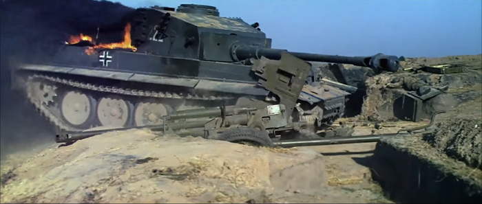 Его же можно увидеть и в кино, но он не едет, а лишь работает декорацией на фоне рукопашной схватки советских и немецких танкистов.