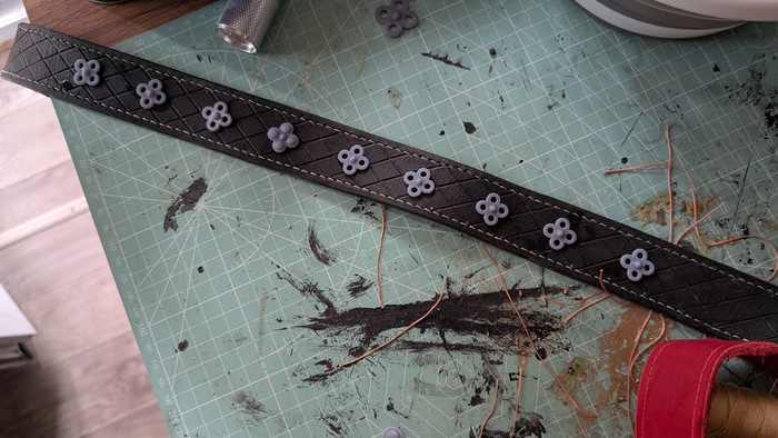 Портупея пробивалась ручным пробойником и прошивалась рукам с двумя иголками(однажды дизайнеры ведьмака не добавили прошитую кромку и у них отвалилась жопа). Для ремня нужно было канавкорезом прорезать узор и затереть его тонким концом сликера.