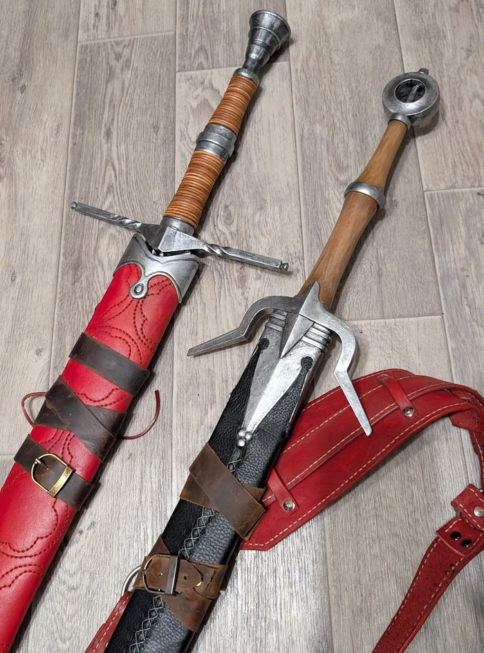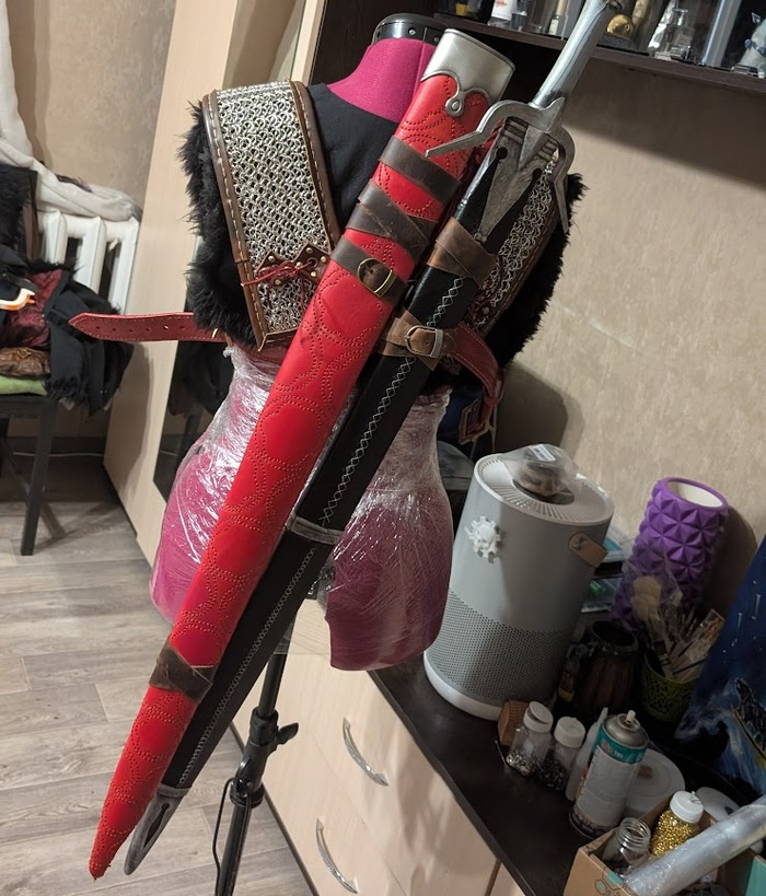 Вторые ножны - главная причина, по которой я вообще начала этот костюм. За полгода до этого мне посчастливилось стать обладателем костюма из третьей части от прекрасной мастерицы, которая перегорела к нему и отдавала чуть ли не за пачку вафель. Я закинула за такое все-таки побольше, отложила костюм ожидать своей очереди на доделку, а когда пришло время определяться с большим проектом, вспомнила про него, получающего естественное состаривание на балконе. К этим ножнам я сделала новое крепление, доделала печатные ограничители и на их размер ориентировалась при печати всего остального