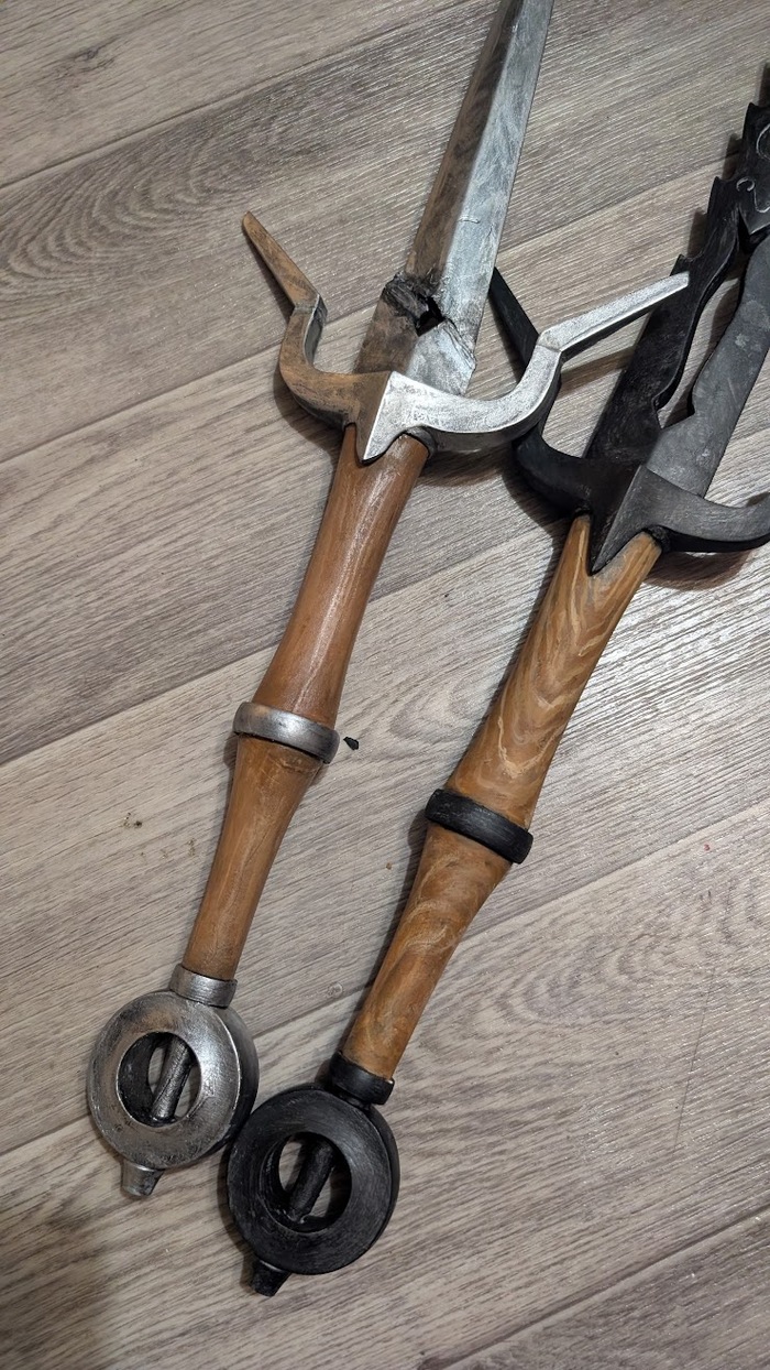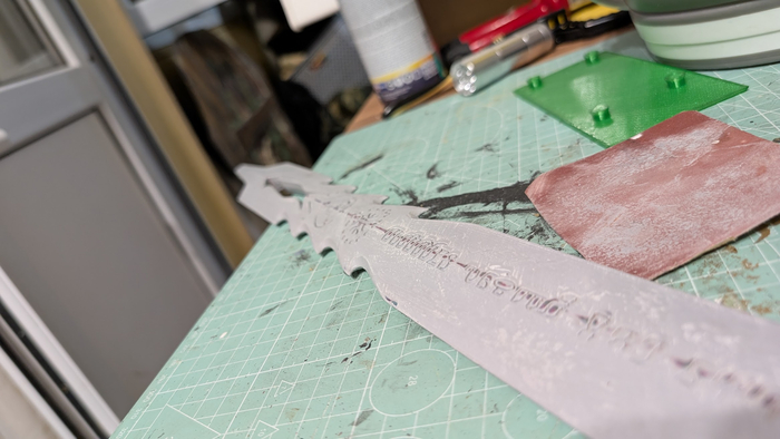 Мечи это моя боль и моя любимая часть одновременно. Сразу скажу, что шлифовала их не я, но схема везде была следующая: грубая шкурка, толстый слой грунта, мягкая шкурка с водой, грунт, последние два пункта повторять до гладкости. Первый меч я напечатала из того что было, пла силк, это стало реально большой ошибкой. Такой пластик не предназначен для постобработки, он нужен сделать красиво изделие как есть и дальше на него нужно только красиво смотреть и правильно дышать(в комментарии могу скинуть примеры таких вещей из этого пластика).