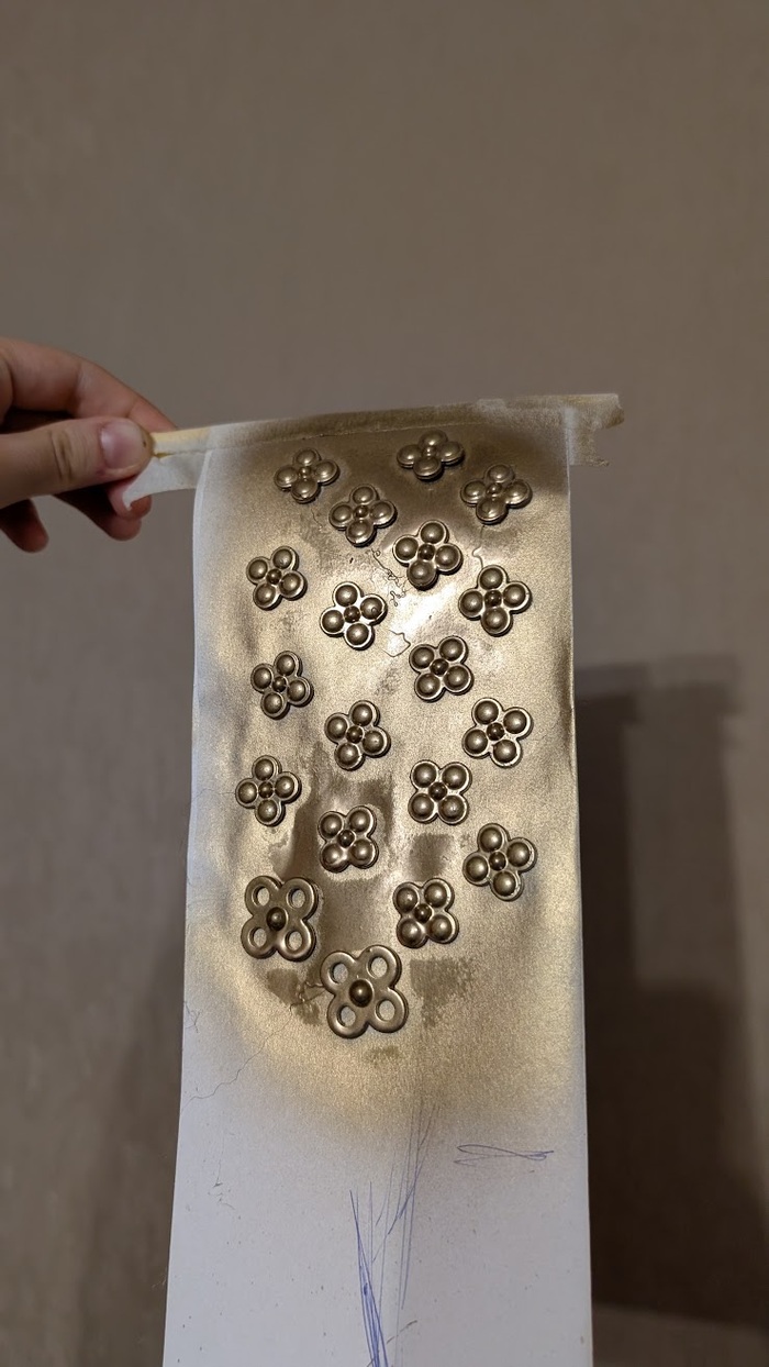 Красились эти мечи акрилом, серебряный выводился из базы цвета темного серебра, стальной из темно-синего металлика, чтобы между ними были отличия. Сверху фигачилась жидкая поталь самой задрипанной кистью этой квартиры для хаотичного эффекта, поверх вторым слоем блики из витражного блестящего белого. У одного рукоять красилась под дерево, второй обмотан какой-то фигней с китайского маркетплейса, которую я зачем-то заказала за полгода до этого.