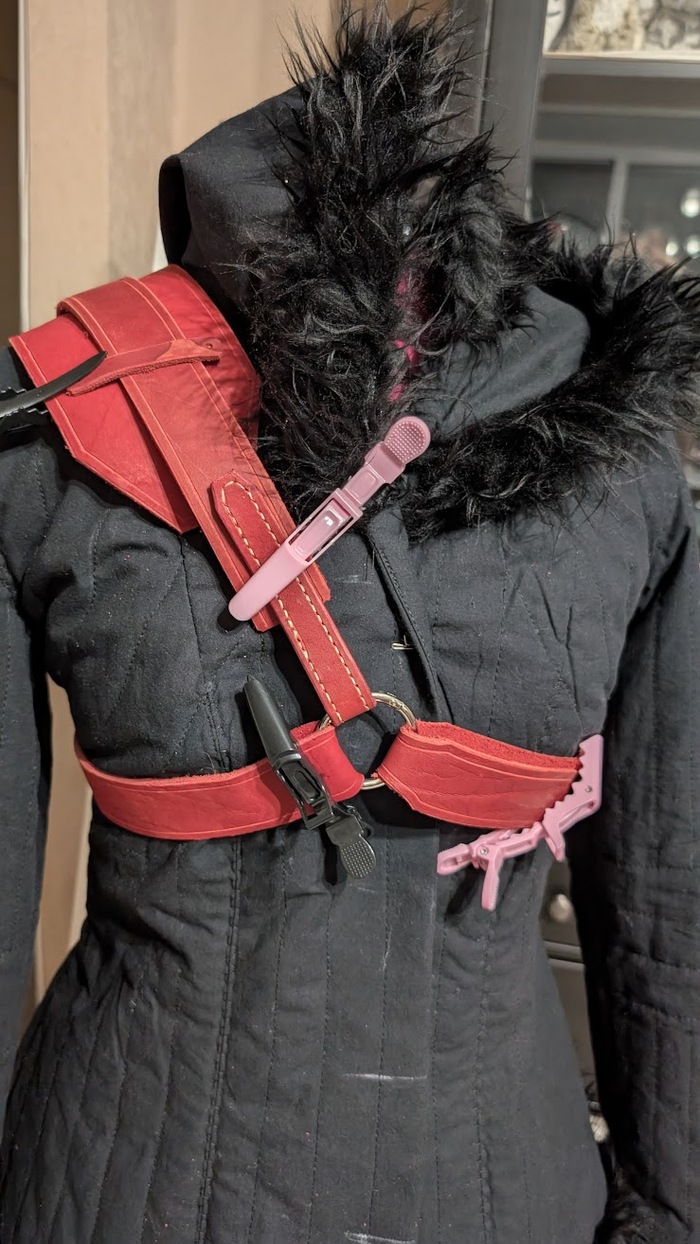 Вся мелкая фурнитура из фотополимерника, докрашенная портупея, зашитые порезы на стеганке, обшитый край плеча, узорчатый изнутри капюшон, типа "отдельные" пришнурованные рукава, состаривание перчаток, цепь для маленьких собак, новый меч