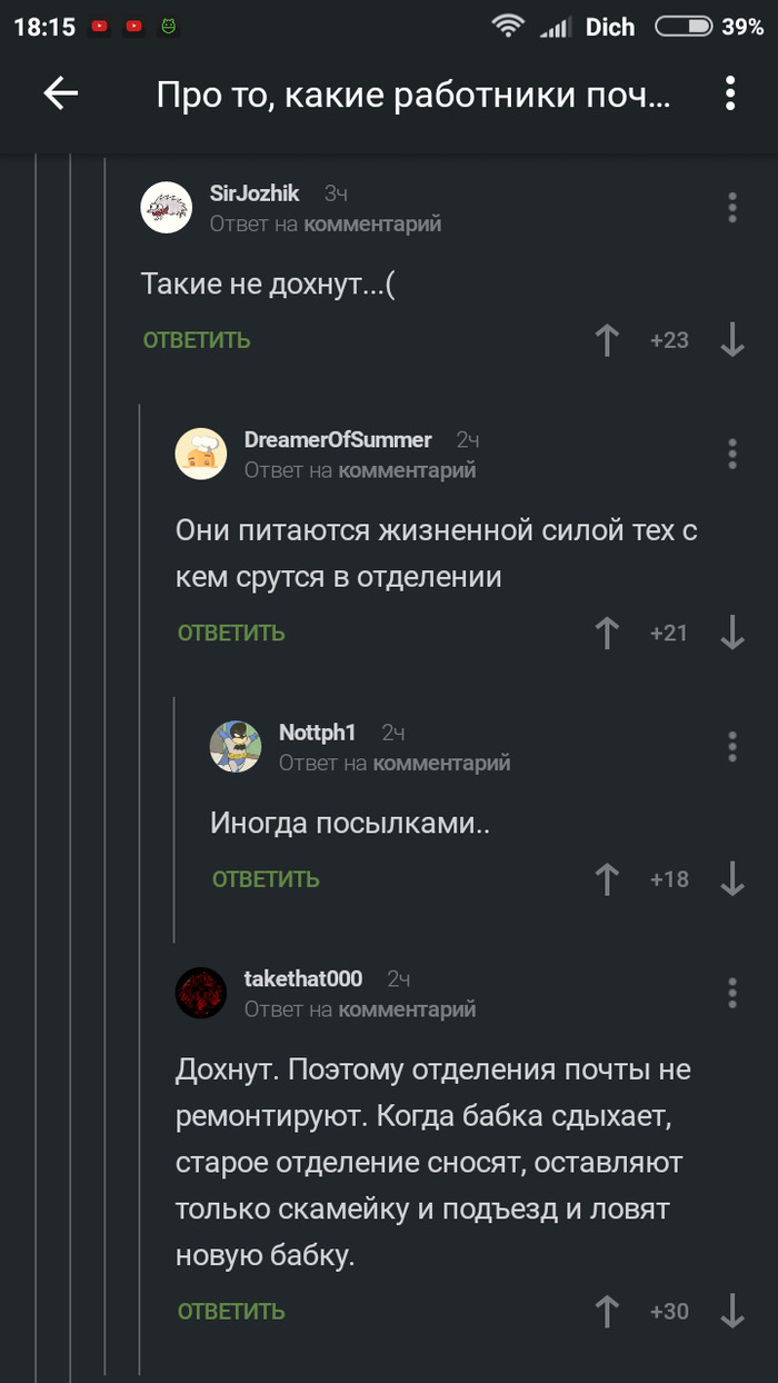 Почтальонши сидят грустные, выслушивают весь этот бред, вздыхают и переживают, что им опять снизят баллы, или что там у них, и лишат премии. Жалко их стало. Хорошие тетки.