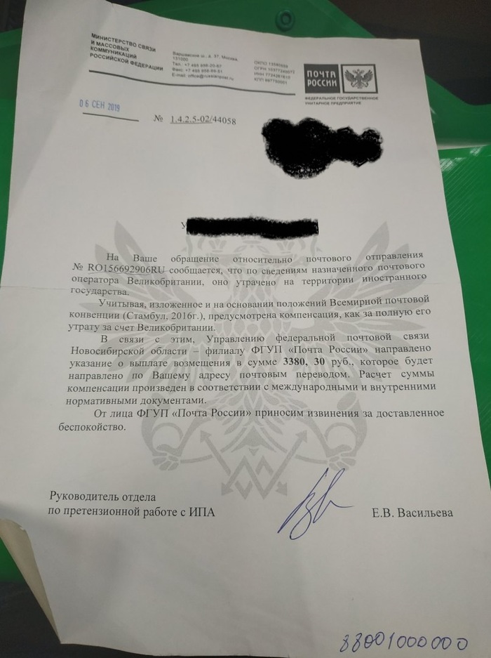 6 сентебря посылку признали официально утерянной. Но перевод мало того что не пришел, с возмещением. так его еще и не отправили :))))))
