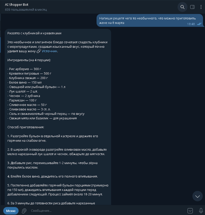 Участники подкинули еще кучу идей и рецептов, а я им рецепты которые они забыли или не знали (ну не я , а ИИ 🙈 ). Помимо чата, мне даже в личку написали прикольный рецепт курицы с терияки - я конечно удивился, но было приятно. Диалог пошел и мы начали с ризотто, перешли на салат с лососем и клубничным джемом - все это, по классике жанра, подсластили десертом.