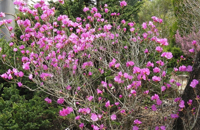 Так вот, эта прелесть не имеет к багульнику болотному никакого отношения и называется рододендрон даурский. Кстати, как бы еще не более ядовитое растение, и в кулинарии не употребляется.