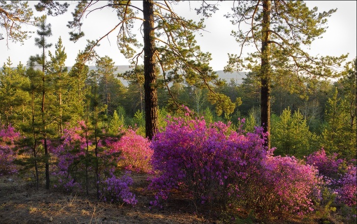 Сопки нежно зеленеют первой молодой листвой. Лиственницы выпустили ярко-салатовые иголочки. Вокруг все такое свежее, молодое, яркое! Между сосен и берёз розово-сиренево-малиново пламенеет багульник.