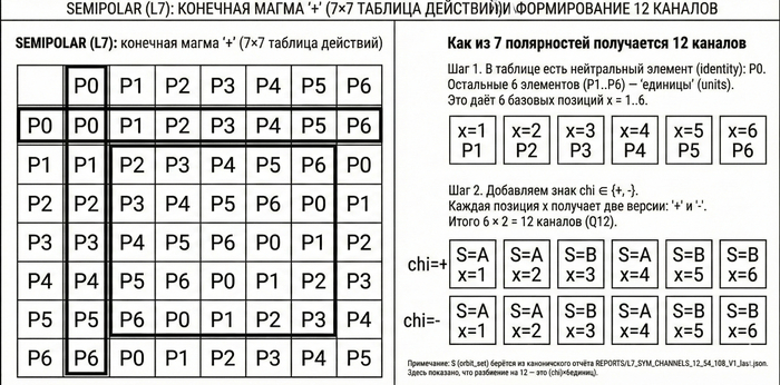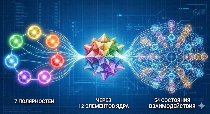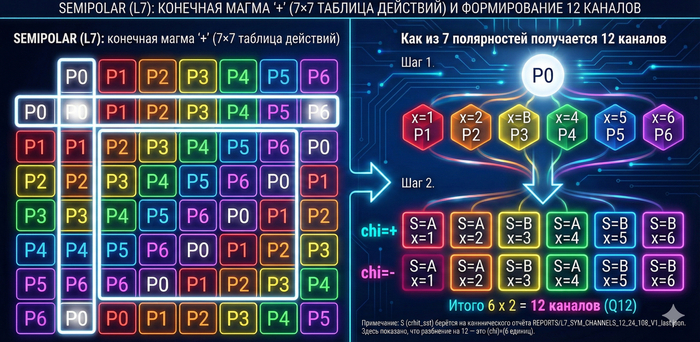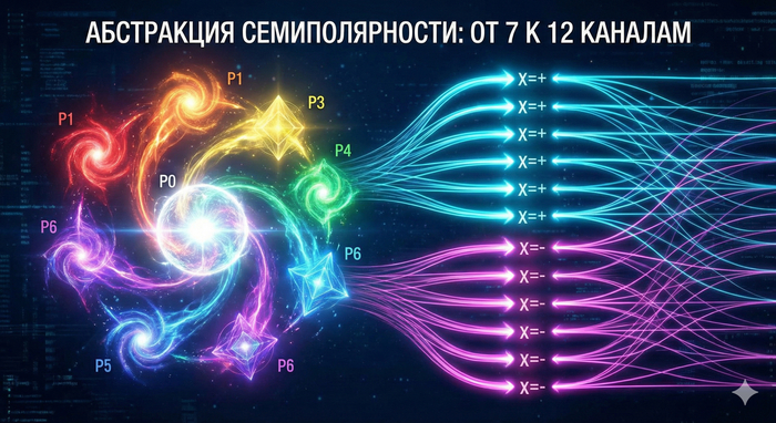 Правая часть инфографики отвечает на вопрос, как из семерки получается число 12, которое часто встречается в разных системах. Здесь нет никакой магии, только структурная логика. Мы берем наши 7 элементов и исключаем P0, так как он является статичным центром. Остаются 6 активных единиц или векторов движения. Далее мы применяем к ним простейший бинарный оператор полярности, который я обозначил как chi, имеющий значения плюс и минус. В итоге 6 активных позиций умножаются на 2 состояния полярности, и мы получаем ровно 12 уникальных каналов (Q12). Это работает так же четко, как адресная шина в процессоре: есть архитектура, и есть строгий лимит возможных состояний, который невозможно обойти.