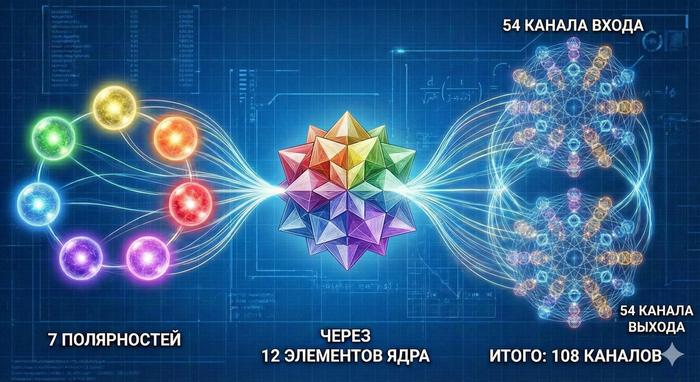Система стабилизировалась ровно на числе 108. Оказалось, что если взять семь базовых элементов, то полная группа их гармоничных связей имеет размерность именно 108 единиц. Скрипт буквально разложил мне «анатомию» этого числа. Внутри него образовалась четкая структура: 54 пары полярных состояний (как «цвет» и «анти-цвет»), которые уравновешивают друг друга. Плюс к этому выделилось ядро из 12 особых комбинаций, которые взаимодействуют в 9 различных измерениях. Если сложить всю эту математику (54 умножить на 2 или сложить группы взаимодействий), мы неизбежно упираемся в 108. Любая попытка добавить 109-й элемент ломала всю симметрию и превращала систему в шум.