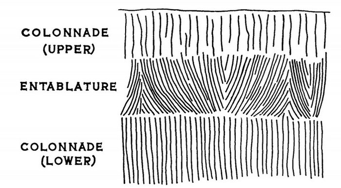Трехчастное строение типичного проявления столбчатой отдельности: сверху вниз — верхняя колоннада (Colonade (Upper)), антаблемент (Entablature), нижняя колоннада (Colonade (Lower)). Рисунок из статьи A. Spry, 1961. The origin of columnar jointing, particularly in basalt flows с одного из обнажений базальтов реки Колумбия