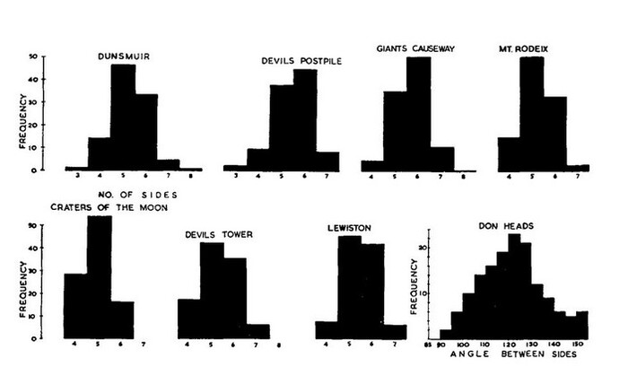 Количество граней у колонн на различных проявлениях столбчатой отдельности — пяти- и шестигранные колонны представлены примерно в одинаковых количествах (первые 7 гистограмм); угол между гранями колонн (восьмая гистограмма, Don Heads в Тасмании) для данного обнажения составляет в среднем 120°. Изображение из статьи A. Spry, 1961. The origin of columnar jointing, particularly in basalt flows