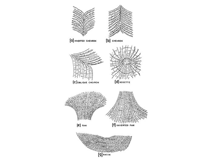 Формы, образованные изгибающимися колоннами. (а) перевернутый шеврон, (b) шеврон, (c) косой шеврон, (d) розетка, (e) веер, (f) перевернутый веер, (g) бассейн. Рисунок из статьи A. Spry, 1961. The origin of columnar jointing, particularly in basalt flows