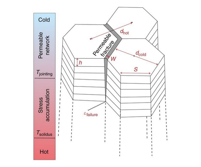 Схематическая диаграмма формирующейся базальтовой отдельности. Верхняя часть более холодная (Cold), нижняя — более горячая (Hot). Расстояние между будущими центрами схематических идеальных шестигранных колонн (dhot) больше ширины застывшей колонны (dcold) на величину W — ширину возникающей трещины. Когда накапливающийся стресс превышает величину механической прочности породы (εfailure), происходит формирование трещины. В уже растрескавшейся части формируется проницаемая сеть трещин (Permeable network), по которой часто циркулируют гидротермальные растворы, стимулирующие их дальнейшее раскрытие. Tjointing — температура формирования трещины, около 890–840 °С, Tsolidus — температура окончания кристаллизации (для базальтов из этой статьи — 980 °С). Изображение из статьи A. Lamur et al., 2018. Disclosing the temperature of columnar jointing in lavas
