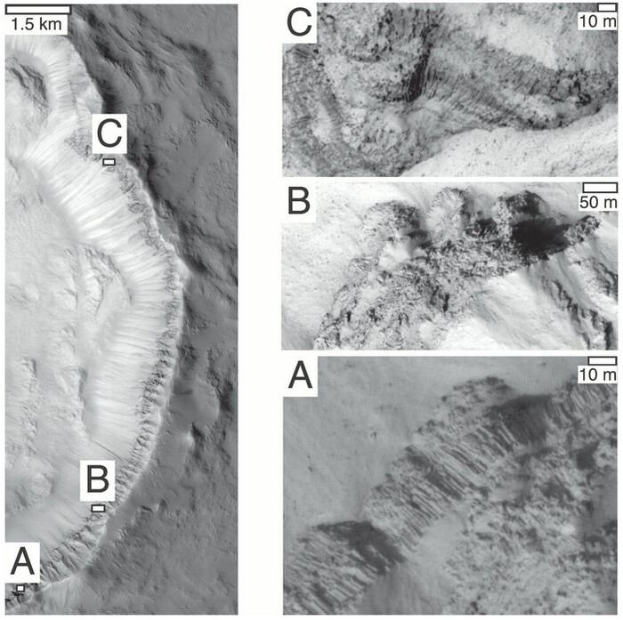 В левой части снимка показан крупный участок долины Марте; A — наиболее репрезентативное обнажение с колоннами 25–30 метров в длину и около двух в ширину, B — веерообразные пучки колонн более метра в ширину, С — тонкие колонны, скорее всего средняя часть структуры (антаблемент). Изображение из статьи M. Milazzo et al., 2009. Discovery of columnar jointing on Mars