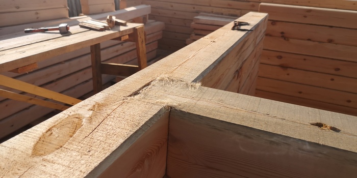 Так вот, начнем с подготовки бруса. Брус мы строгаем снаружи и изнутри, для того, чтобы поверхности были максимально гладкими, меньше впитывали влагу и минимизировать вероятность появления нежелательных соседей в виде насекомых и плесени на стенах