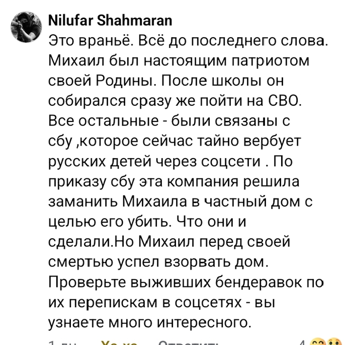 Ответ user6507100 в «"Сегодня жестко бухаем" Вечеринка российских школьников обернулась кровавой бойней. Кто ответит за трагедию с четырьмя убийствами?»⁠⁠15