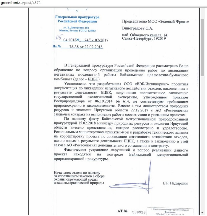 Председатель "Зеленого Фронта" Сергей Виноградов: "К сожалению, "Росгеология" всеми правдами и неправдами пытается "протащить" заведомо ущербный проект. К счастью, Генеральная прокуратура последовательно не дает ей это сделать. Теперь задача и наша, и общественности Иркутской области - детально изучить новое техническое задание, чтобы не дать сомнительным технологиям подтолкнуть Байкал к катастрофе, на грани которой он уже находится много лет. Мы будем запрашивать в правительстве региона всю информацию, касающуюся новой корректировки проекта".