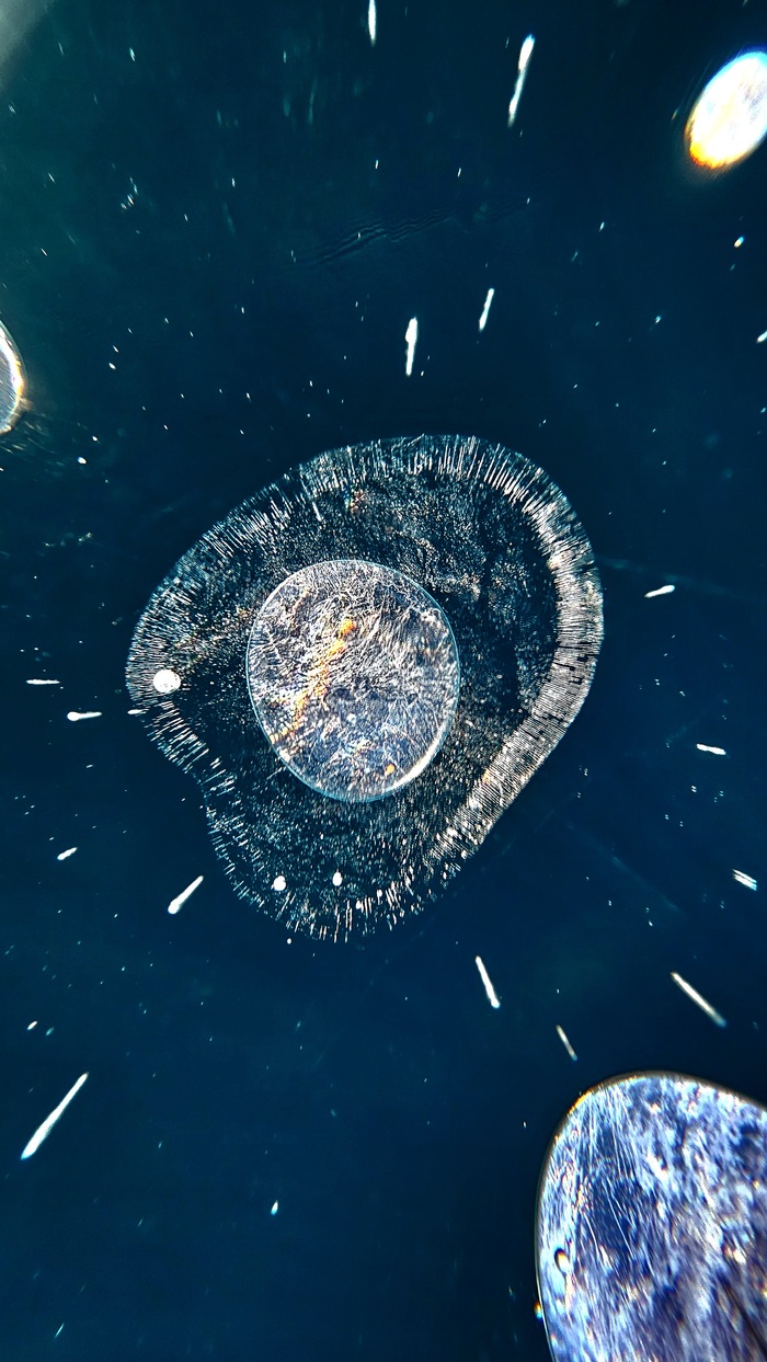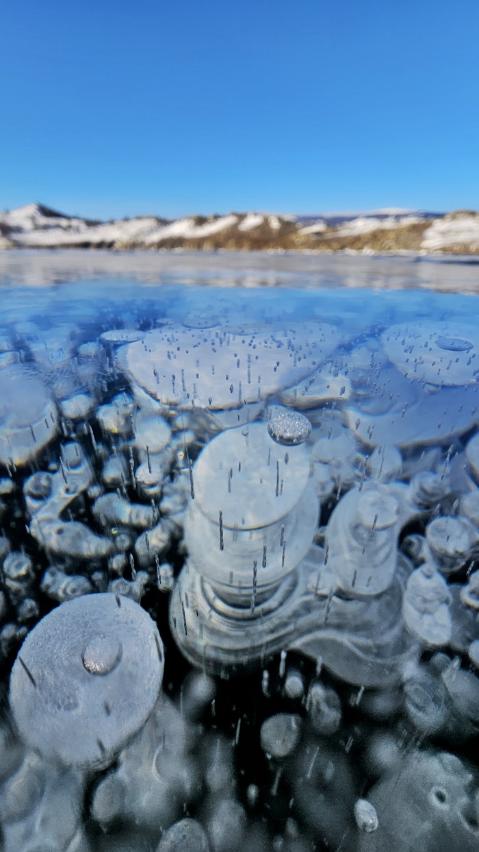 Ещё одно необычное ледяное явление — грозди пузырьков во льду. Это метан, который поднимается со дна и застывает в толще льда. Получаются волшебные белые «шарики» или радужные облака похожие на космические галактики. Сейчас модно заливать прозрачной смолой всякие предметы, так и в метровую толщину байкальского льда часто вмерзают пузырьки, а так же, рыбы, растения, животные и иногда невнимательные рыбаки.