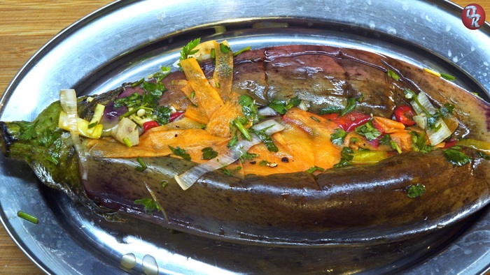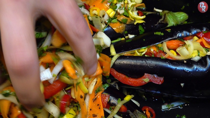 Когда баклажаны остыли добавляем их в миску к другим овощам, поливаем соусом и перемешиваем.