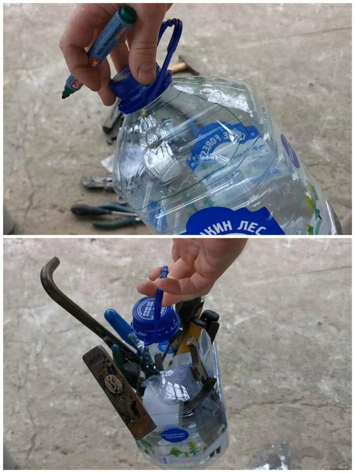 Может показаться, что это ерунда всё, но нет. У меня так на даче на террасе 3 баклашки забитые инструментом стоят. В них всякие ключи, молотки, гвоздодеры. Удобно :) Надо просто вырезать в верхней части 5л бутылки два симметричных трапециевидных окна :)