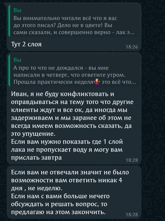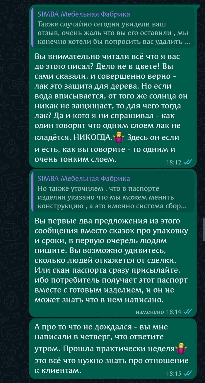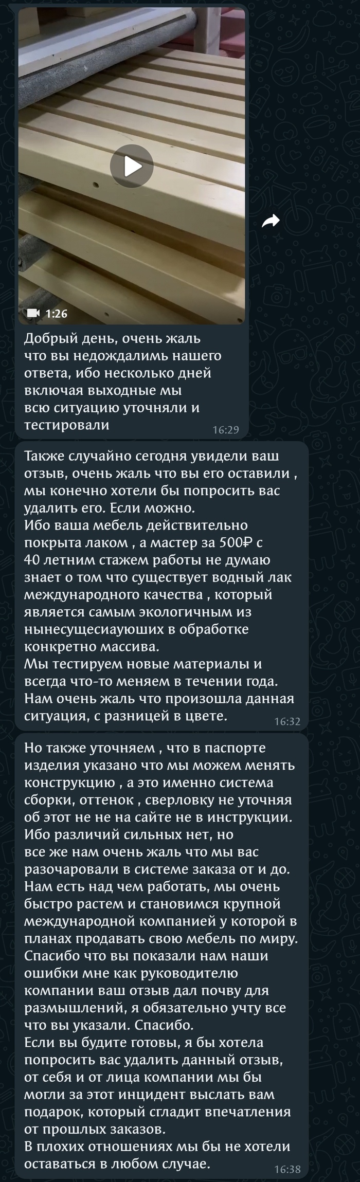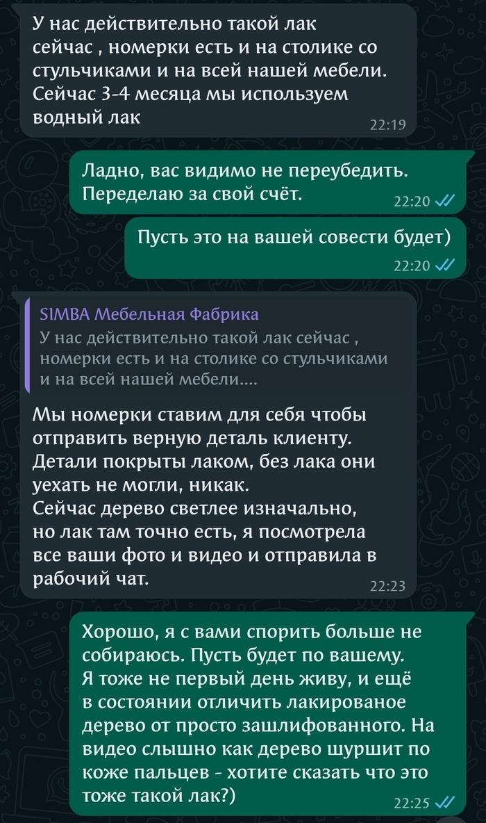 Дальше в основном голосовые сообщения. Но суть такая - это новый лак на водной основе, и он просто невидим. Шершавость на ощупь - это нормально для такого лака. На все аргументы (что наждачной бумагой тёрли и разницы лакированного покрытия и стёртого нет; Что лак не может быть невидимым, и что он наносится для защиты дерева; Что даже визуально детали просто отшлифованы - на них пыль лежит; Что по их же отметкам маркером на деталях видно, что маркер нанесён просто на отшлифованное дерево, и что лака нет ни под ним, ни над ним), нам отвечали одно и тоже - вы не понимаете, это такой лак! А пыль якобы лежит поверх лака, который невидимый. А иногда складывалось впечатление, что мы и вовсе разговариваем о разных вещах. После нескольких часов споров, руководитель Вера сказала, что даст ответ утром, и больше на связь не вышла.