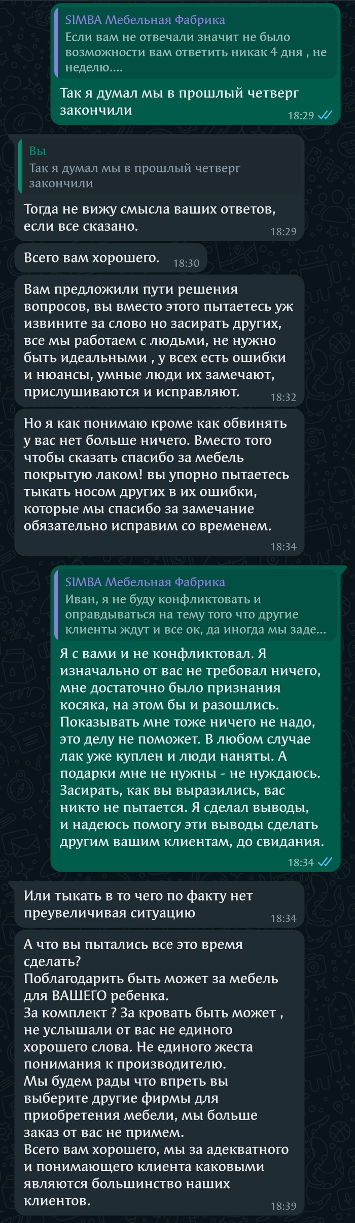 Спустя ещё какое-то время с нами связались еще одни знакомые - и у них та же самая история с задержкой (но уже в связи с переездом на новое место), и всё то же предложение вернуть деньги, но уже аргументируя это тем, что покупатель задаёт слишком много вопросов (Почему они не ставят в известность о переносе сроков? Что они не знали заранее о переезде? Ну и всё в таком роде). Мы им ответили точно так же - что у Веры такая манера общения, не обращайте внимания. После пары дней споров они всё - таки пришли к единому мнению, и эта история закончилась так же, как и две предыдущих - расшатанная нервная система и красивая собранная детская мебель.