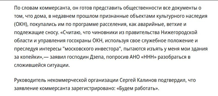 Можно было бы подумать, что это просто совпадение, и что бизнесмен обратился к Калинову за помощью в отстаивании своих прав, как и положено гражданину РФ. Но есть проблема: Калинов поддерживал притязания Дзепы и защищал его от нападок градозащитников и судебных решений буквально за 16 часов до первых новостей об открытии АНО «ННН». Доказательством этому служит новость в личном канале Калинова, в которой тот отстаивает принадлежавшую Дзепе недвижимость.