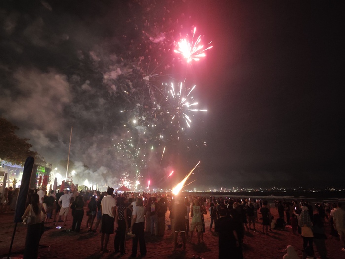Лейтенант весь вечер спит. Как стемнело начинают палить фейерверки. В 23:00 выдвигаемся на пляж. Улица полностью забита байками и пешеходами. На пляже посвободнее. Отлив и полоса песка намного шире чем днём. Толпа разбивается на кучки и люди рассаживаются на песке. Местные жгут фейерверки и с неба периодически прилетают недогоревшие кусочки зарядов. Полночь.