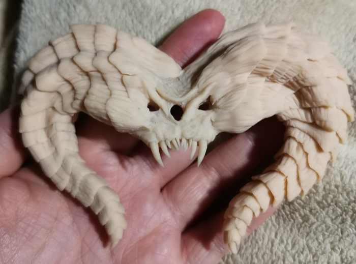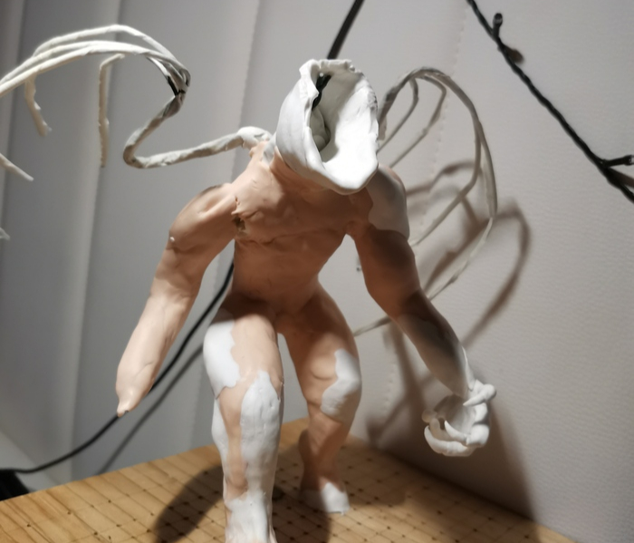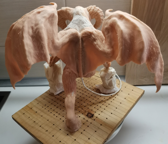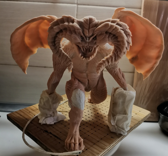 В какой-то момент мне надоело мучить тело и я решила зафигачить крылья. Это оказалось полезным, потому что фигурка сразу оформилась и воодушевила меня всё-таки ее закончить. Буквально за неделю работы по вечерам я перешла к вот таком результату. Вырезала прожилки, закрепила голову. Это сразу после запекания