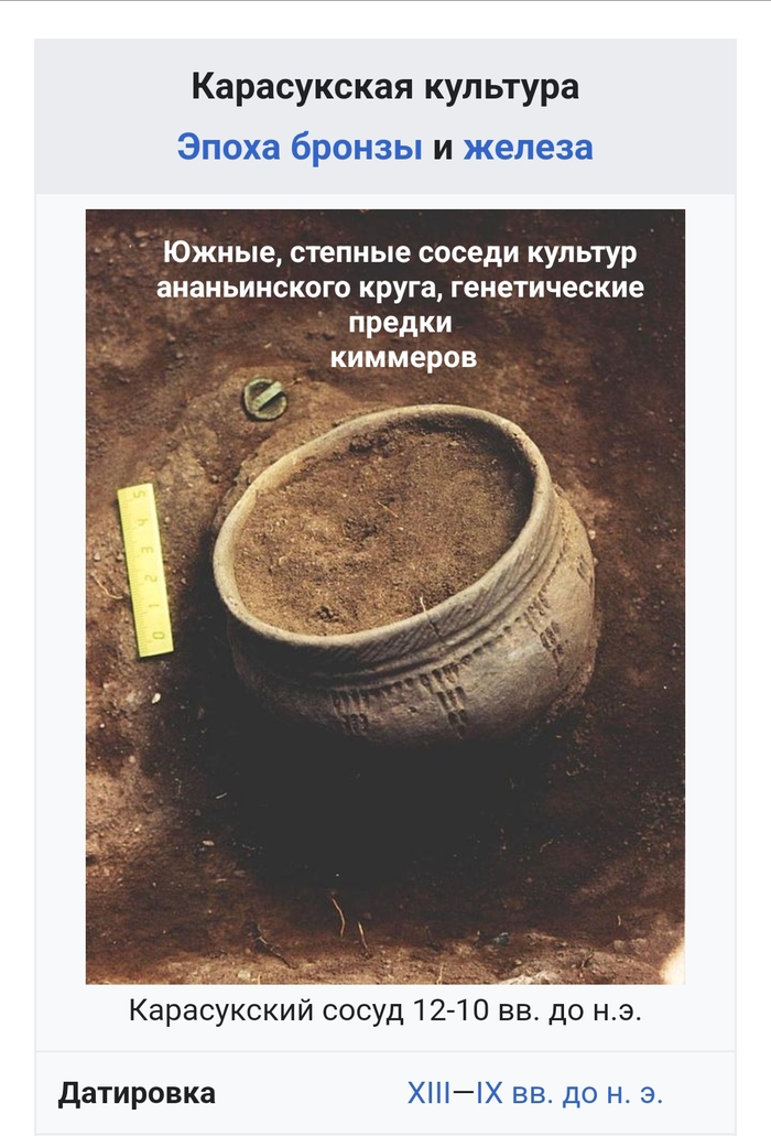 Карасукцы? Что это за чувачки? Это те самые киммерийцы которые устроили Катастрофу, наследили от Англии (Кимберленд) до Алтая. И от Карелии (озеро Куйваш) до Египта (акайваша). Благодаря им Киев назывался изначально Куяба, а Киевщина - Куявия. В честь них у нас до сих пор называется область - Чувашия, хотя сами чуваши не индоиранцы, как куйваши, а тюрки. Но хватит домыслов, даёшь строгий официоз! В очередной раз бесстыдно сворую из Википедии: