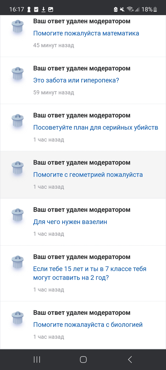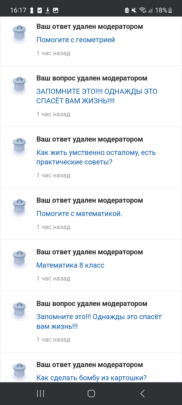 На днях создал аккаунт в прекраснейшем сайте маил.ответах, делал продуктивные ответы в основном на тему ДЗ алгебры и геометрии, делал их особенно качественно и старался над созданием хорошего ответа, ну кому то я не полюбился, скорее всему мелочному и жалкому модератору и он стал массово удалять мои прекрасные ответы.