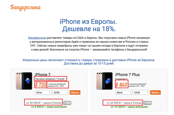 Добрые люди украли у жены iPhone 6, гореть им в аду, поэтому было решено купить семерку - ради чего начал изыскания по продавцам. И натолкнулся на очередную недобросовестную рекламу любимой Бандерольки, где написано, что они, наши благодетели, привезут нам из Берлина ойфон аж на 18% дешевле, чем в немытой Рашке.