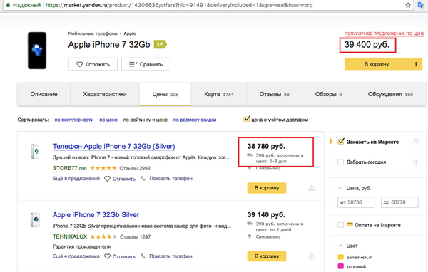 И я, как покупатель не совсем тупой, пошел на Яндекс.Маркет, где, несмотря на уверения Павла Соболя и маркетинга Бандерольки, цены на iPhone 7 32 gb начинаются вовсе не с 53 000 рублей, а совсем даже с 38 890, причем в стоимость уже включена доставка в течение 1-3 дней, а если нужно быстрее - можно самовывозом прямо сегодня.
