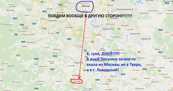 Сейчас посылка в г. Львовский, и мне очень интересно - куда бл*** она поедет дальше...