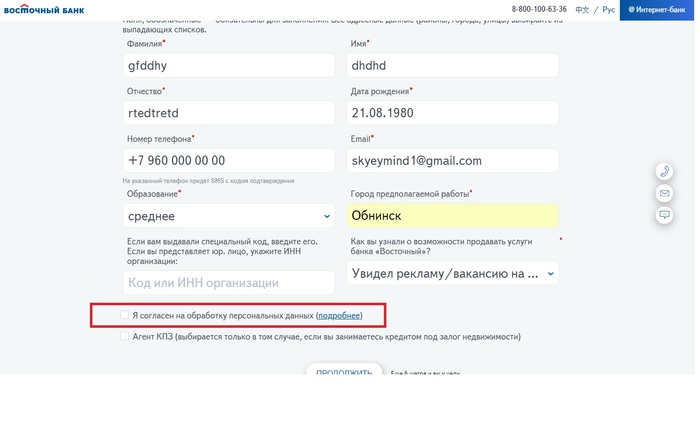 В соответствии с требованиями Федерального закона от 27.07.2006 № 152-ФЗ "О персональных данных" я выражаю свое согласие на обработку ПАО КБ "Восточный" своих персональных данных