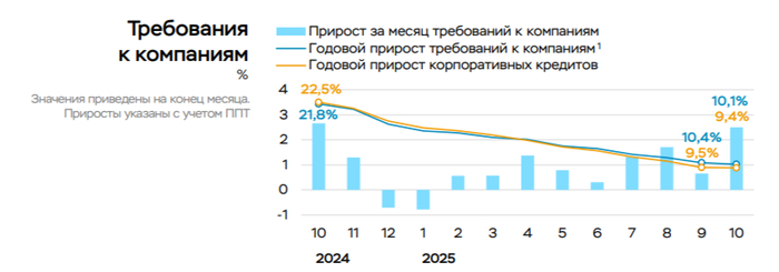 🏦 Отчёт ВТБ за октябрь: кредитный портфель юридических лиц снизился до 16,5₽ трлн (-0,1% м/м), портфель кредитов физических лиц сократился до 7,4₽ трлн (-0,8% м/м). В 2025 г. банк планирует провести секьюритизацию (упаковка кредитов в облигации) части кредитов физлиц (потребность в капитале и ликвидности).