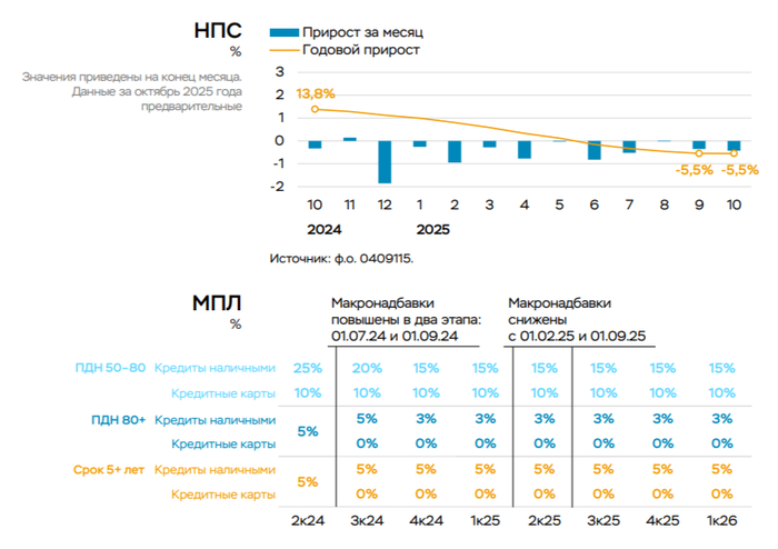 По данным ЦБ, в октябре 2025 г. портфель кредитов физических лиц увеличился на 335₽ млрд и составил 38,3₽ трлн (0,9% м/м и 4% г/г, в сентябре +263₽ млрд). В октябре 2024 г. он увеличился на 192₽ млрд (существенное отличие). Кредитование значительно ускорилось: выдачи в автокредите пошли в рост за счёт скидок/льгот от автопроизводителей/утильсбора, ипотека из-за господдержки и снижения ставки третий месяц подряд превышает по выдаче уровни прошлого года (рыночная ипотека превысила показатели прошлого года). В корпоративном кредитовании значительное повышение относительно прошлого года и месяца: