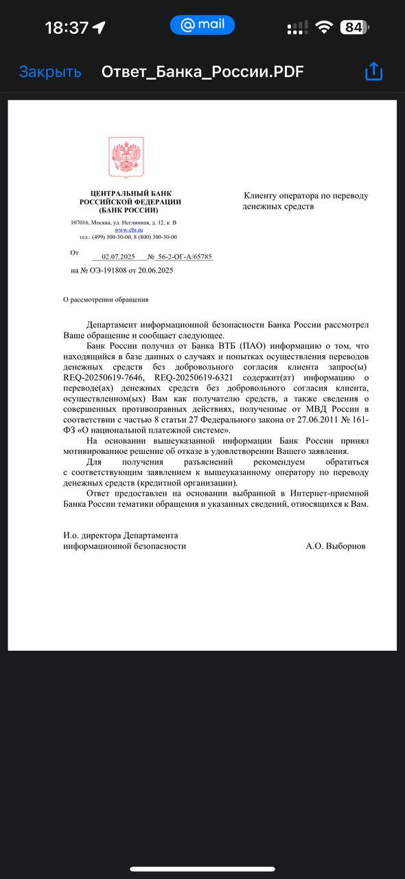 Как видно из ответа - мои данные направили в ЦБ РФ банк клиентом которого я никогда не был, а именно ВТБ, а так-же якобы сведения от МВД о совершенны противоправных действиях.