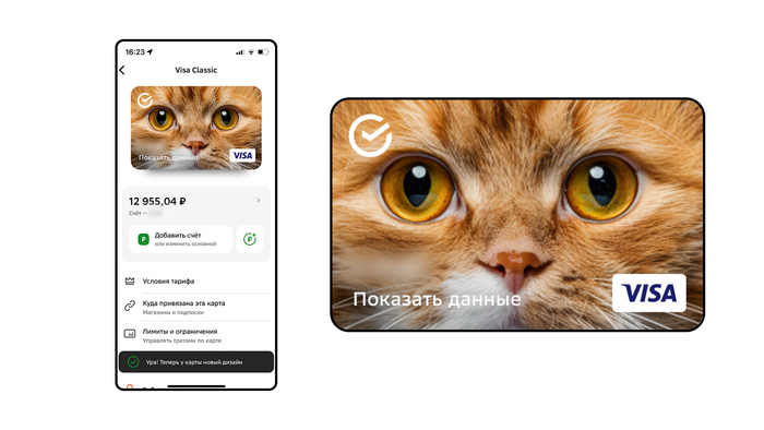 Предположим, вам приглянулся дизайн с котом из списка картинок Сбера. Вот как теперь будет выглядеть ваша карта в приложении СберБанк Онлайн.