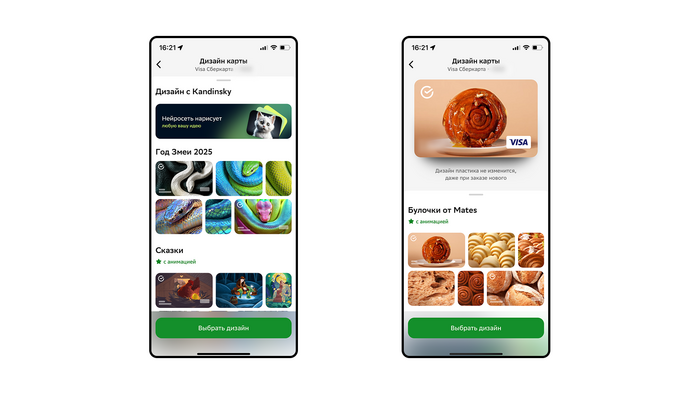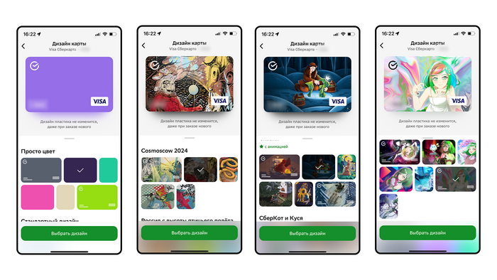 Кстати, еще есть анимированные дизайны, которые «оживают» на экране приложения и при оплате со SberPay. Если хотите именно дизайн с анимацией, выбирайте внимательно. При желании вы можете изменить и дизайн физической карты. Для этого выберите подходящий вариант и закажите новую карту.