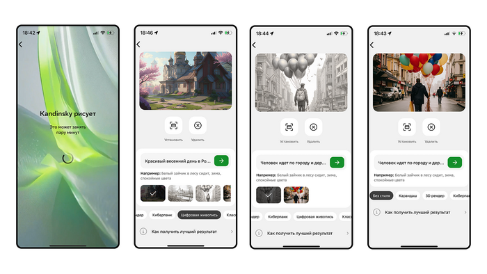 Также можно придумать любой сюжет и сгенерировать его при помощи нейросети Kandinsky. Для этого в списке выберите пункт «Дизайн с Kandinsky», придумайте промпт на русском языке и подождите, пока ИИ сгенерирует картинку. Если нужно, предварительно примените один из стилей. Например, сейчас доступна цифровая живопись, киберпанк, карандашный рисунок и другие.